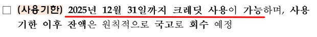 - 2025년 12월 31일까지 크레딧 사용 가능하며, 사용 기한 이후 잔액은 국고로 회수될 예정