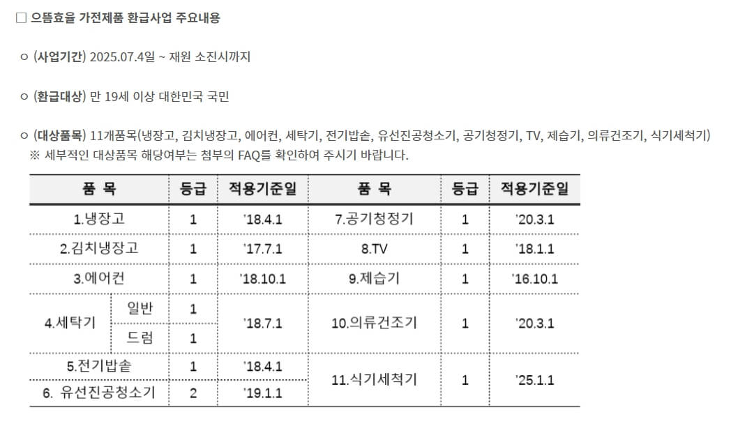 | 전국민 대상으로 냉장고, 에어컨, TV 등 11개 고효율 가전 제품 구매 시 구매가격의 10%(1인당 최대 30만원)를 지원하는 사업입니다. 대상 기간: 2025년 7월 4일 이후 구매 제품 유의사항: 예산 소진 시 조기 종료 가능 |