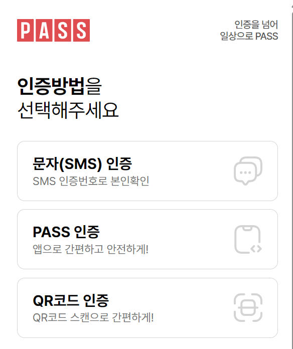 '본인인증 하기' 누르시면 아래의 인증방법 선택 화면이 나옵니다.